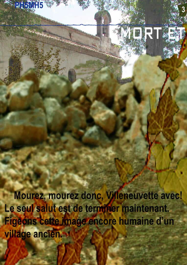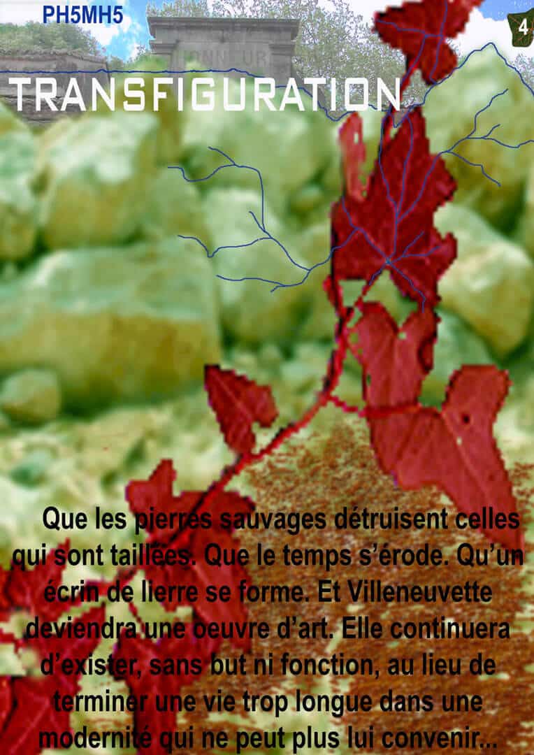 Ce concours visait à requalifier le village « fatigué » de Villeneuvette. L’action artistique, volontairement provocante, proposait de mettre le lieu entier dans un écrin de pierres et de lierre. Acceptant le déclin de cet endroit, l’art était vu ici comme une échappatoire, une belle fin valorisant la glorieuse histoire du village.