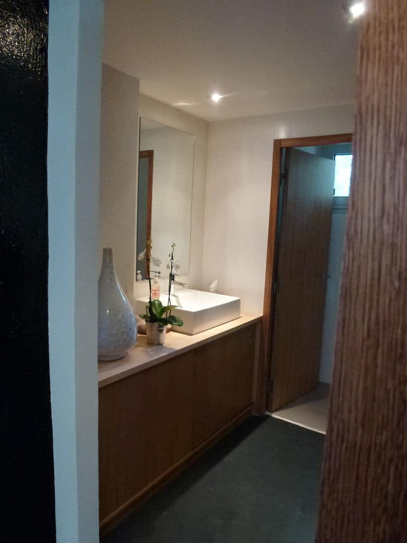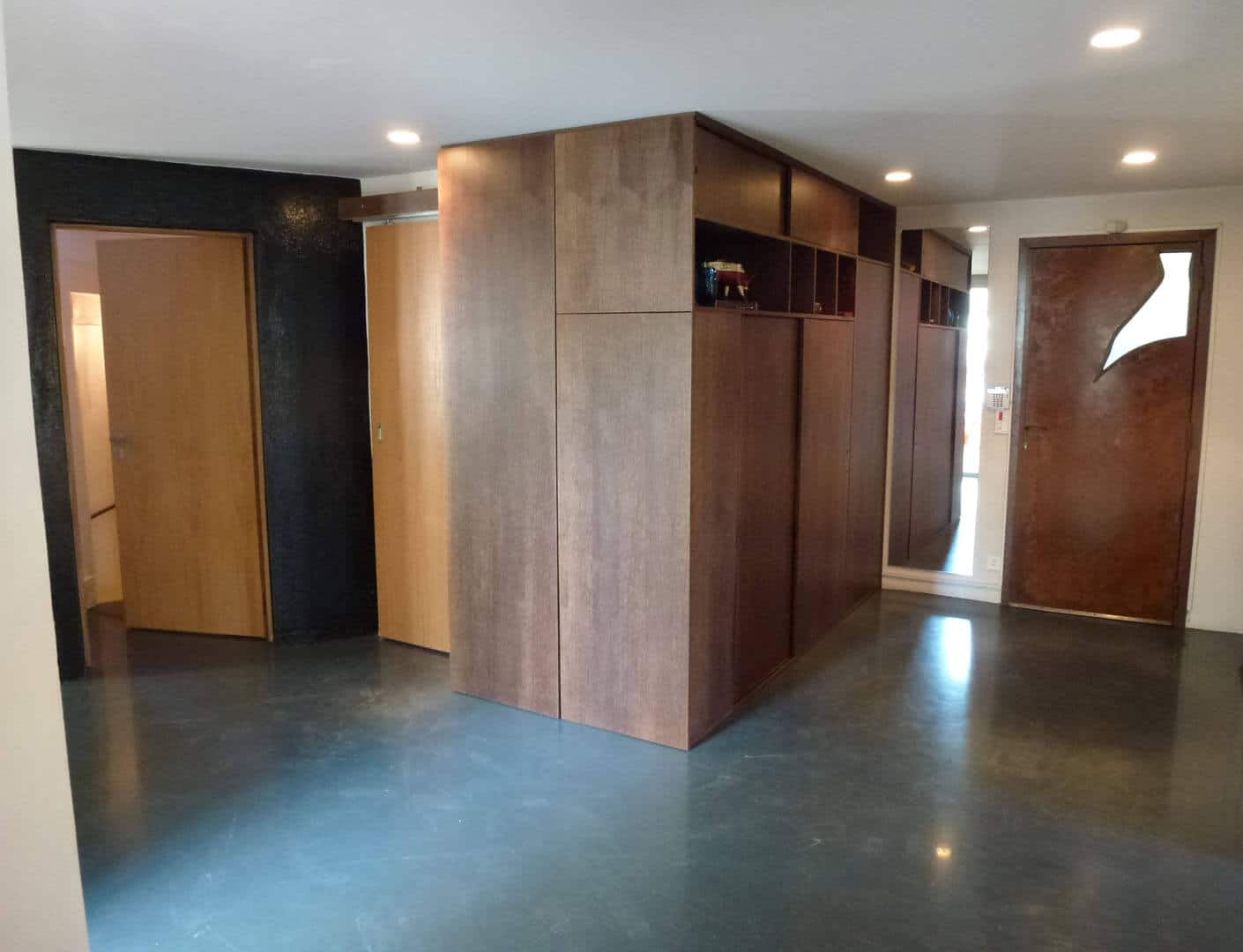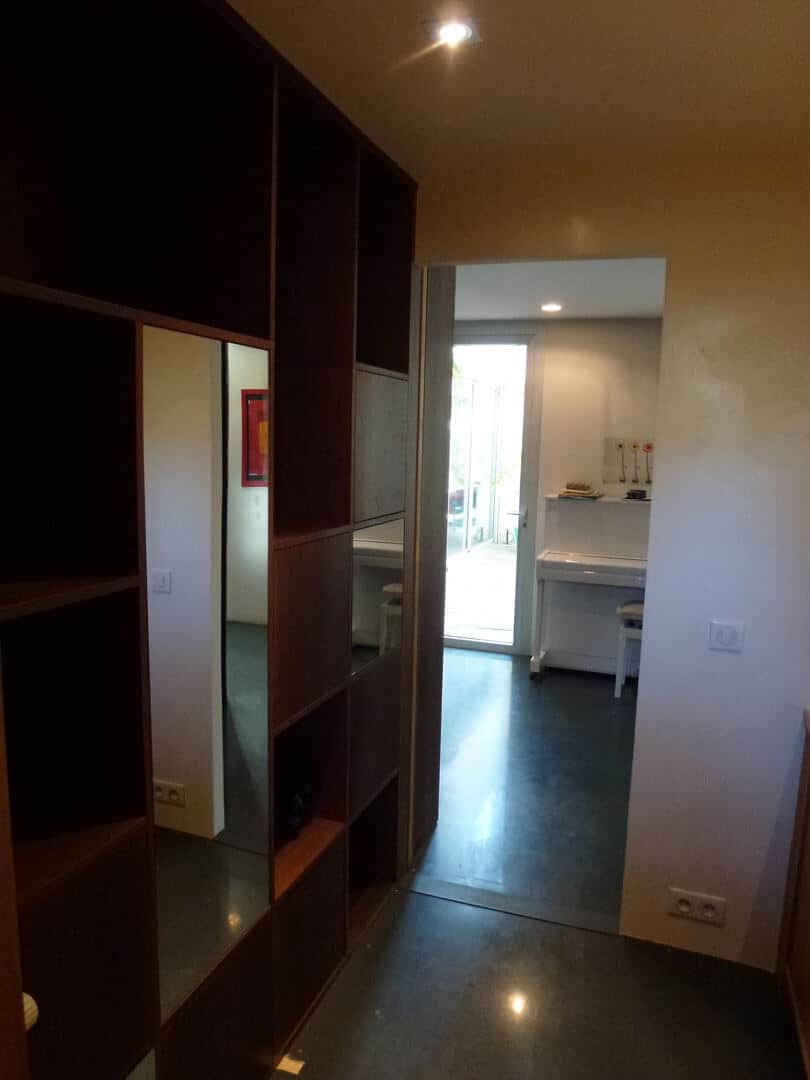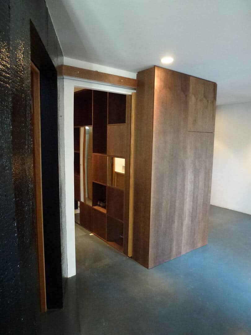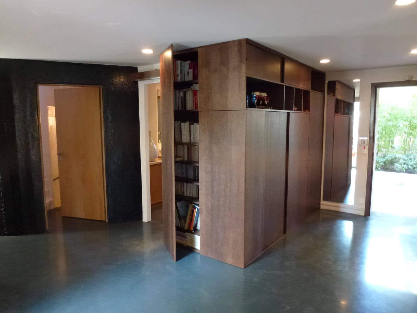 Ce projet oscille entre le mobilier et l’espace. Un très grand meuble, servant à la fois de bibliothèque, de rangement et de cloisonnement, vient habiller une cloison existante, et requalifier l’espace d’accueil, trop souvent oublié dans une maison. En chêne teinté wengé, il contraste avec le sol et le plafond, pour donner envie au visiteur de découvrir toutes ses faces, et leurs différents usages.